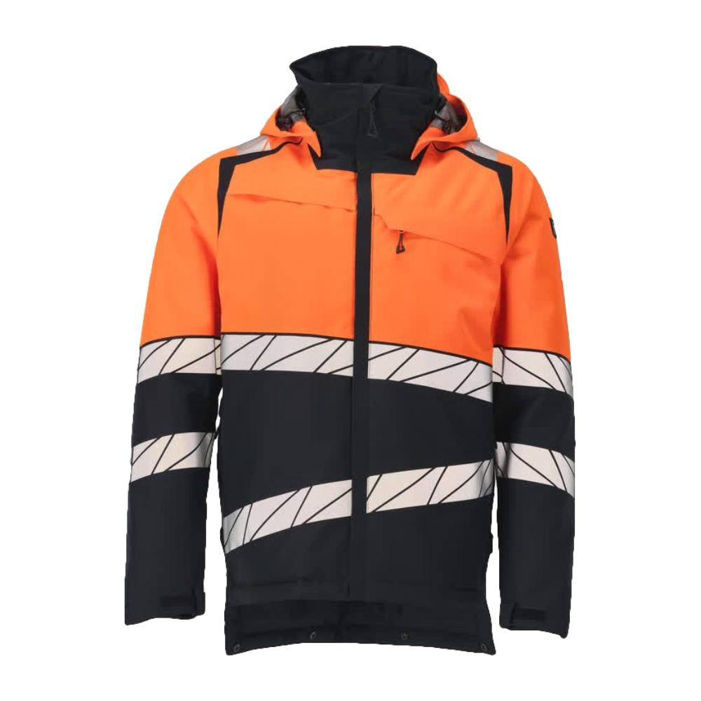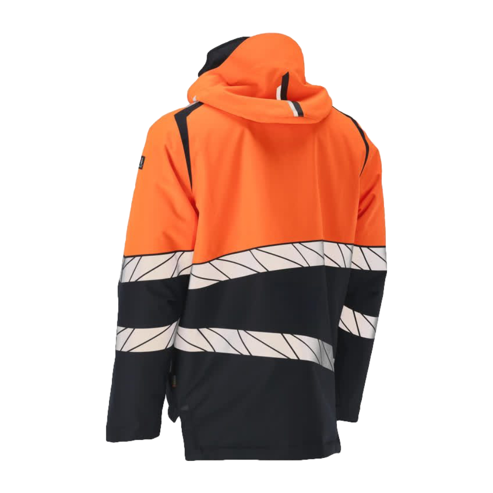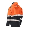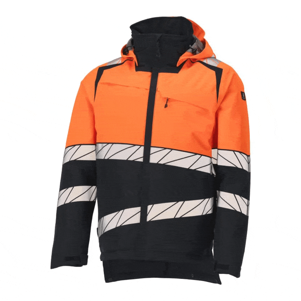 Дышащий, ветрозащитный и водоотталкивающий материал двух цветов со светоотражающими полосами.