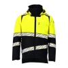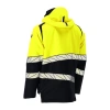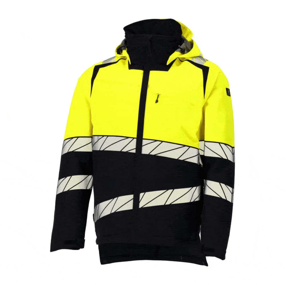 Дышащий, ветрозащитный и водоотталкивающий материал двух цветов со светоотражающими полосами.